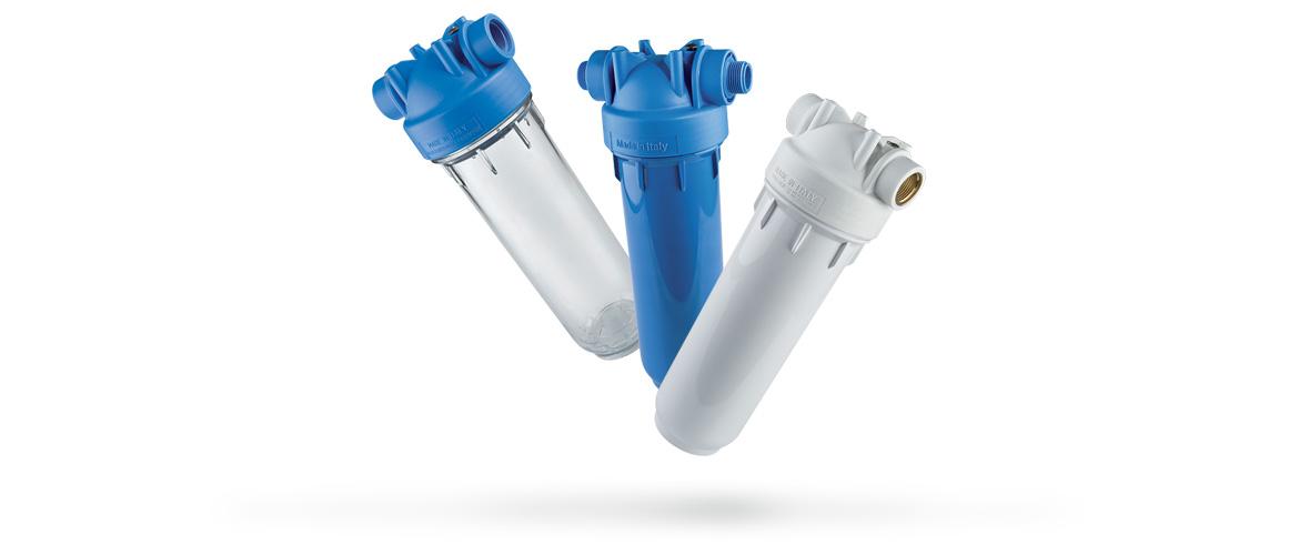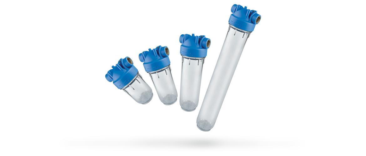 et les cartouches spéciales BX à raccord rapide avec double joint torique (SOE – joint torique 222). Le positionnement correct des cartouches SX est garanti par le dispositif de centrage Filter-Fit. Les filtres à eau DP sont disponibles avec des cuves transparentes ou opaques (en version bleue ou blanche) qui varient en fonction des cartouches désirées de 5” à 20” de hauteur. Pour répondre aux différents besoins, ils sont également fournis en version M avec manomètre et en version S avec entonnoir de vidange. Les raccords D’ENTRÉE/SORTIE sont multiples : 1/4”, 3/8”, 1/2", 3/4“, 1”, 1-1/4”, 1-1/2” BSP avec ou sans insert en laiton ou en plastique et avec filetage conique NPT en versions 1/4", 1/2", 3/4", 1”. En plus de ces filtres à cartouche, une large gamme d’accessoires et de pièces de rechange est également disponible. Ce système est breveté à l’international.